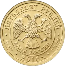 Аверс: в центре — в центре - эмблема Банка России (двуглавый орёл с опущенными крыльями, под ним - надпись полукругом "БАНК РОССИИ"), обрамленная кругом из точек и надписями по кругу - вверху: "ПЯТЬДЕСЯТ РУБЛЕЙ", внизу: слева - обозначения драгоценного металла и пробы сплава, в центре - дата выпуска, справа - содержание химически чистого металла и товарный знак монетного двора.