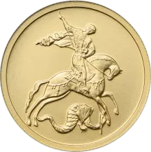 Реверс: рельефное изображение Георгия Победоносца на коне, поражающего копьем змея.