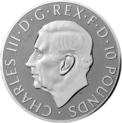 На аверсе изображен портрет Его Величество короля Карл III, номинал, инициалы дизайнера.Надпись: CHARLES III D G REX F D 10 POUNDS MJ