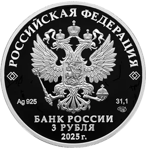 Аверс: рельефное изображение Государственного герба Российской Федерации, над ним вдоль канта – надпись полукругом «РОССИЙСКАЯ ФЕДЕРАЦИЯ», обрамленная с обеих сторон сдвоенными ромбами, под гербом слева – обозначения драгоценного металла и пробы сплава, справа – содержание химически чистого металла и товарный знак монетного двора, внизу в центре в три строки – надпись «БАНК РОССИИ», номинал монеты «3 РУБЛЯ», год выпуска «2025 г.».