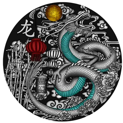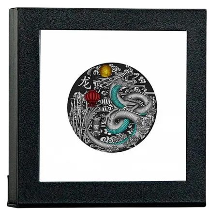 Серебряная монета весом в 3 унции, посвященная Году Дракона, и она принадлежит к серии «Lucky Charm». Монета имеет качество античной отделки, у нее потрясающий декор и точный горельеф, она поставляется в футляре вместе с сертификатом подлинности. Ограниченный тираж 500 штук по всему миру.