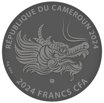 На аверсе монеты изображено изображение головы Дракона и надписи по всему периметру: "REPUBLIQUE DU CAMEROUN" - страна-эмитент, "Ag 999" - проба серебра, "2000 FRANCS" - номинал", " 2024» — год выпуска.